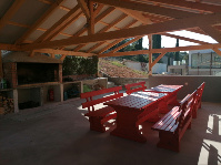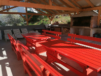 POKRIT PIKNIK PROSTOR (70m2): Velik kamin, elektrika, voda in pomivalno korito, 10 m delovnega pulta, vsak apartma ima svojo mizo s klopmi,