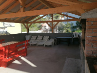 POKRIT PIKNIK PROSTOR (70m2): Velik kamin, elektrika, voda in pomivalno korito, 10 m delovnega pulta, vsak apartma ima svojo mizo s klopmi,